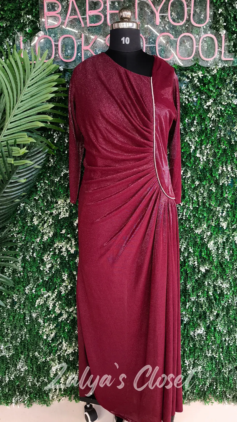 Ruffled Bodycon Maroon/ Green Dress With Shimmer Work Imported